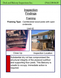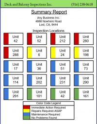 A typical inspection report (pdf) can contain 50 to 100 images along with text descriptions in the “Findings” section of that report. Our reports begin with a color-coded Summary page that provides an easy-to-understand overview of the status of all decks, balconies, walkways, and entries in your facility.